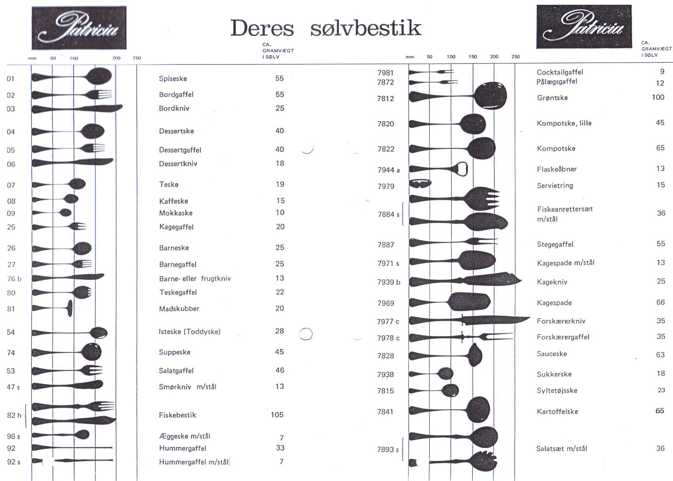 Herunder ses mål og vægtskema for standarddele til Patricia, Da bestikket er